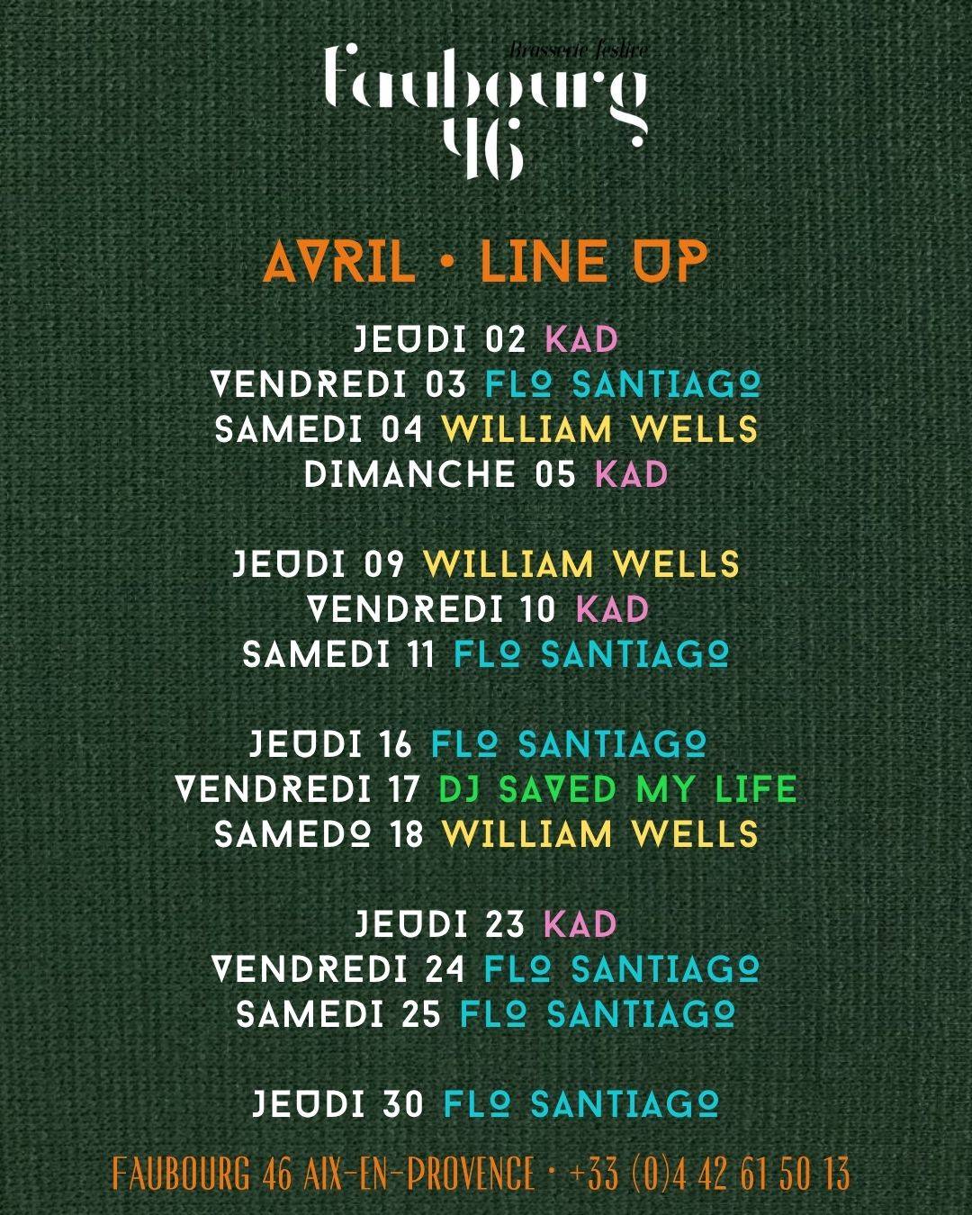 Ne manquez pas la line-up avril 2026 au Faubourg 46 et laissez-vous porter par l’énergie du lieu tout au long du mois.